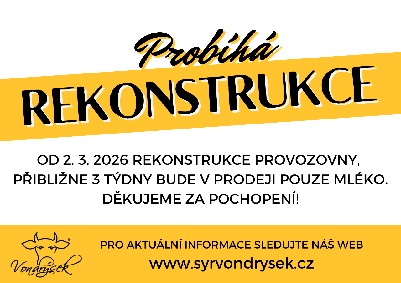 V březnu vypukla námi dlouho očekávaná rekonstrukce provozovny. Po dobu rekonstrukce můžete očekávat výpadek výroby mléčných produktů. Zakoupit můžete pouze mléko. Nastanou dny, kdy nebude možný ani prodej mléka, a proto nás nezapomeňte sledovat na facebookových stránkách nebo na našem webu. Důležité změny s Vámi budeme sdílet. Věříme, že Vás nové prostory potěší stejně jako nás, proto Vás prosíme o shovívavost.